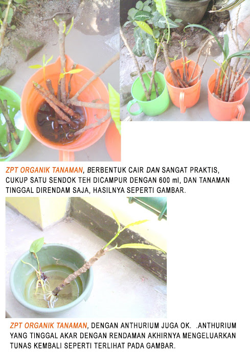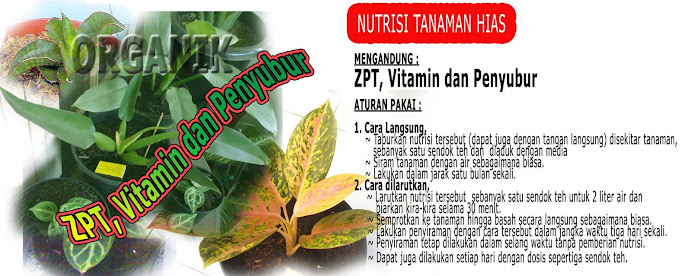 - Setelah mendalami tanaman hias, khususnya dalam merawat dan memelihara, sejenis pupuk atau nutrisi organik digunakan selama ini ternyata cukup baik untuk itu kami ingin memperkenalkan kepada siapa saja yang berminat. Nutrisi ini benar-benar diolah dari bahan-bahan non kimia alias organik, yang mengandung unsur-unsur yang dibutuhkan oleh tanaman. Secara umum kandungan nutrisi ini untuk jenis "Nutrisi Organik Tanaman" (NOT-b), adalah ZPT, penyubur dan vitamin. Dan untuk jenis "ZPT Organik Tanaman" (ZOT`c) berupa cair berupa auksin dan sitokinin yang sudah dikenal dalam tanaman. Kami memperoduksi secara terbatas (stock), karena keterbatasan, tetapi senantiasa bersedia menerima permintaan dalam jumlah besar bagi yang berminat. Untuk produksi perkenalan sangat menarik............!